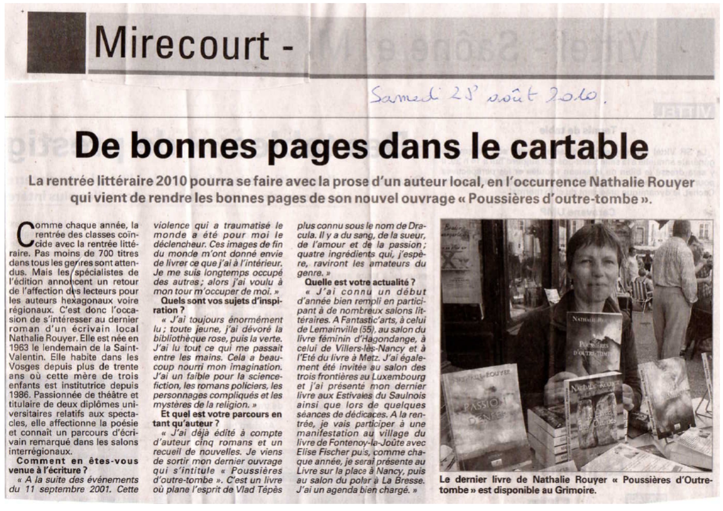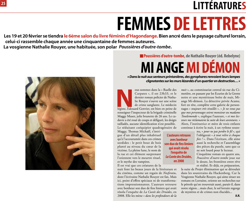 Nathalie Rouyer, née à Nancy, le 15 février 1963, est institutrice à Mirecourt dans les Vosges. Passionnée de théâtre, de poésie et d’écriture, elle nous fait partager son goût des intrigues où se mêlent policer, aventure, psychologie, amour et fantastique.